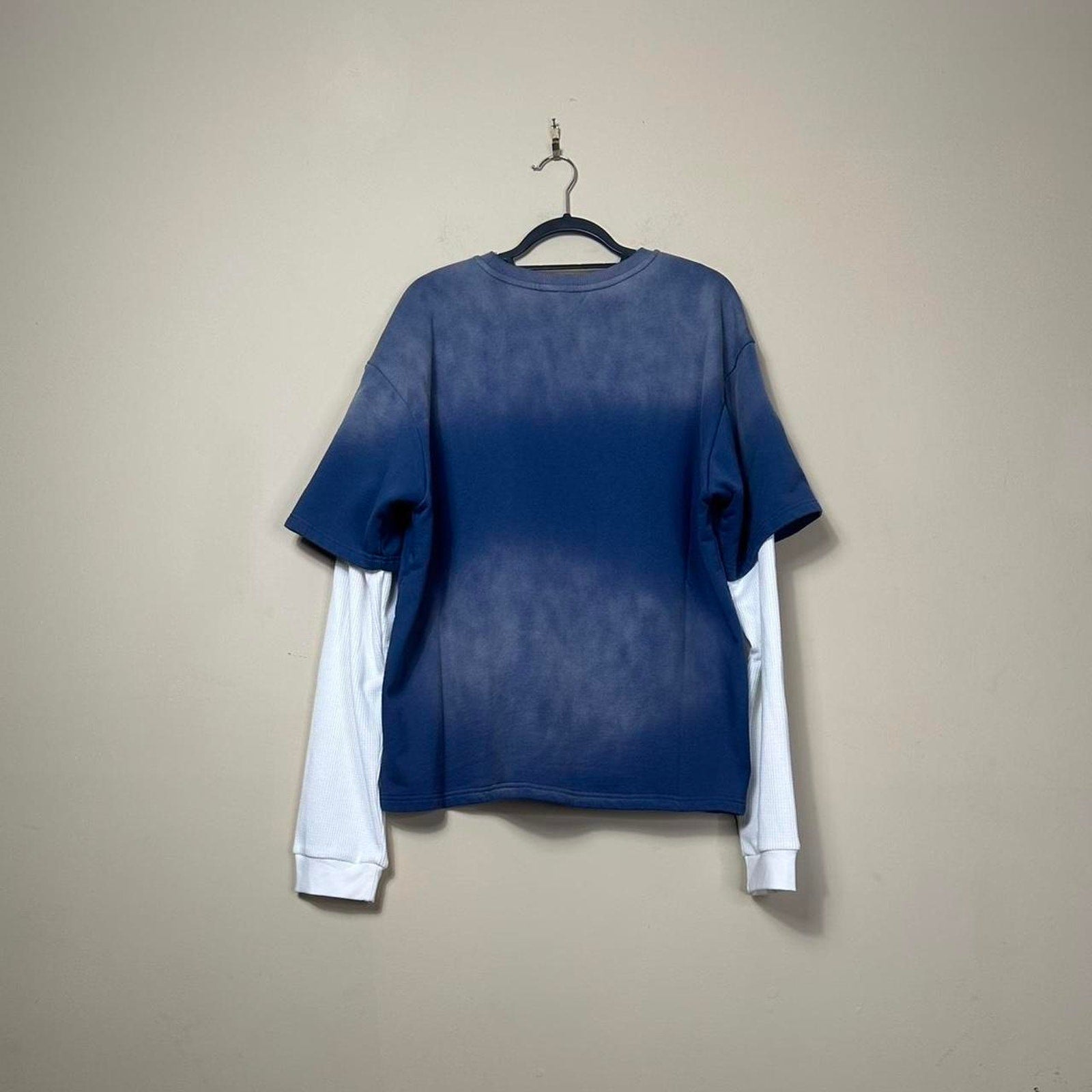 heathered blue, layered tee, long sleeve, Y2K style, nostalgic, cityscape print, oversized fit, casual streetwear, graphic design, modern retro